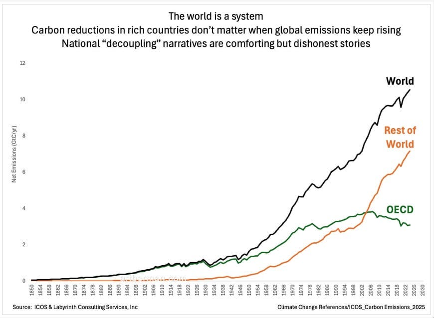 The world, however, is a single physical system—and global carbon emissions are rising, not falling. The ECIU’s case rests almost entirely on rich countries that have outsourced their emissions. That is the core flaw. The analysis emphasizes OECD countries, where domestic emissions appear to be declining, while downplaying the rest of the world, where emissions are rising rapidly (Figure 2). When viewed as a whole system, there is no decarbonization success story. There is no good news at the global level.